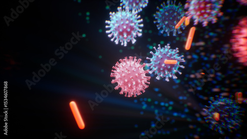 Abstract visualization of bacteria and viruses in air, coronaviruses and pathogens randomly dispersed, conceptual image