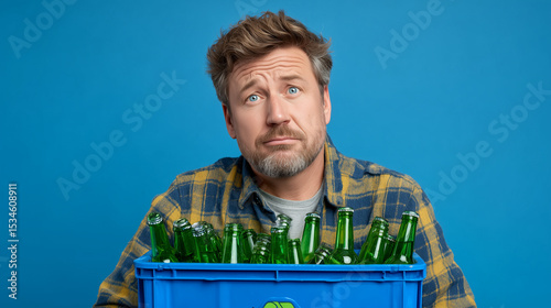Mężczyzna w kratę trzyma niebieską skrzynkę pełną pustych, zielonych butelek po piwie, z zakłopotaną miną na niebieskim tle.