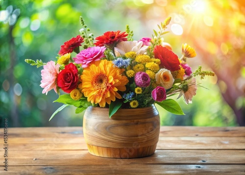 Beautiful colorful mix of fresh flowers arranged in a wooden vase with soft natural light