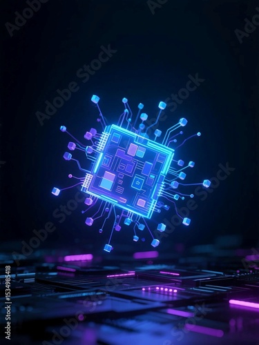 Neon Glowing Microchip in Dark Tech Environment – Futuristic AI Technology Concept