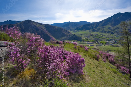Russia. Mountain Altai. A flowering bushes of Ledebur rhododendron (maralnik) on the slopes of the mountains along the Chuysky tract near the village of Kupchegen.