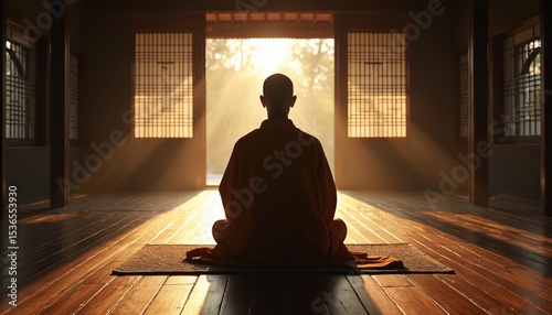Buddhist monk practices Zazen meditation in peaceful place. Sunlight shines through wooden window, creating serene atmosphere. Practice of mindfulness, promoting inner peace, spiritual growth in