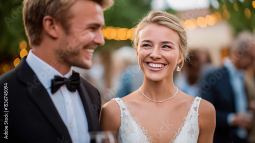 Wedding reception in backyard with bride and groom mingling