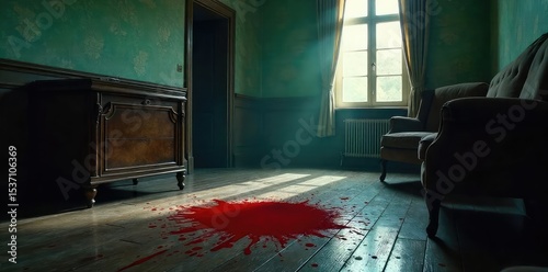A dimly lit room, overturned furniture, a single crimson stain on the polished floor suggests a violent struggle and a tragic end , room, horror, dark room