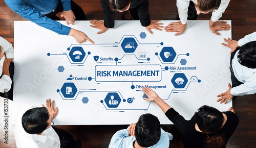 A diverse team engages in a strategic discussion on risk management concepts, focusing on security, control, and crisis management while collaborating at a corporate table. Amity