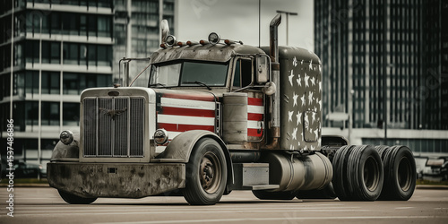 Zardzewiała ciężarówka z amerykańską flagą na masce, stojąca na tle nowoczesnych budynków. Klasyczny pojazd z elementami retro i militarnymi.