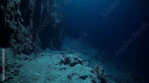 Underwater Ocean Floor With Blue Light, Silent Marine World With Dark Deep Sea Environment and Subaquatic Exploration Concept