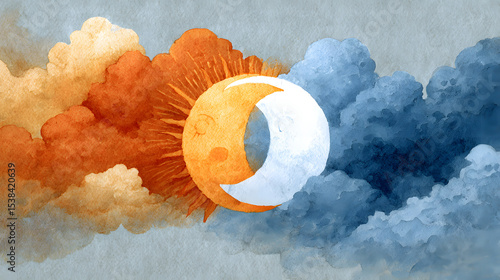 Sun and Moon Harmony: Watercolor sun and moon with soft clouds in day and night contrast.