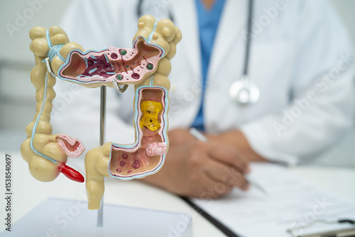Intestine, appendix and digestive system, doctor holding anatomy model for study diagnosis and treatment in hospital.
