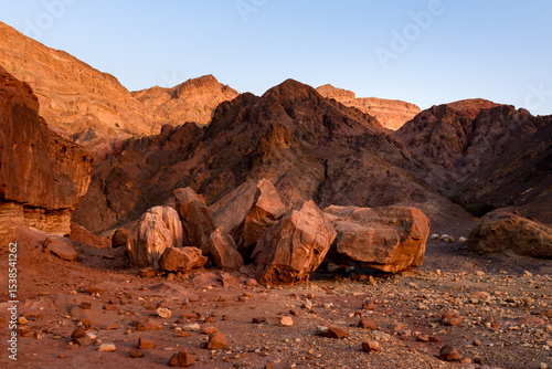 Multi-colored rocks and mountain peaks of the Arava Desert in southern Israel's Eilat Mountains.
