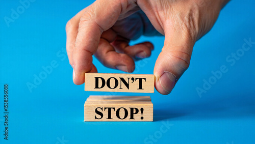 A hand places a wooden block with the words dont stop on top of another block that says stop