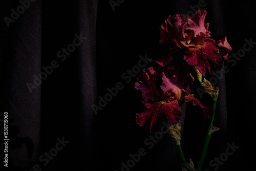 Dark red irises with water droplets captured in moody lighting against a black fabric backdrop. Elegant floral still life with deep shadows and rich texture