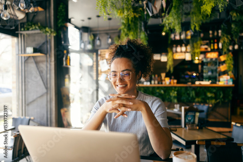 Cheerful remote worker sitting in cafe and smiling at the laptop.