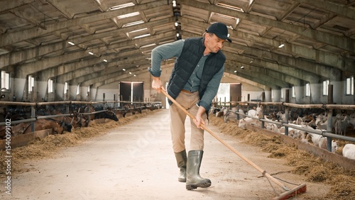 Attractive hardworking Caucasian man cleaning farm. Busy fermer with broom actively sweeping and raking up hay. Lambs standing in stable and chewing dried grass. Domestic animal concept.