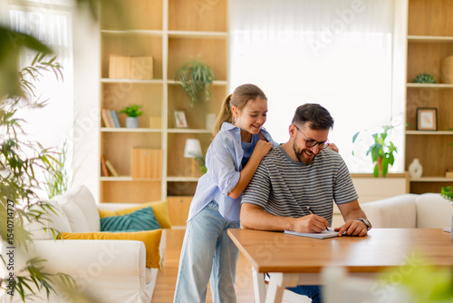Joyful moments shared between a father and daughter while writing at home in a bright, cozy living room filled with greenery