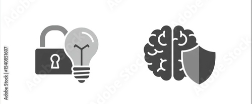 A graphic featuring a padlock and lightbulb next to a brain with a shield, all in shades of gray