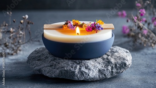 A small, round, white candle, nestled in a dark-blue bowl, sits atop a gray stone. Small, colorful flowers adorn the candle's wooden lid.
