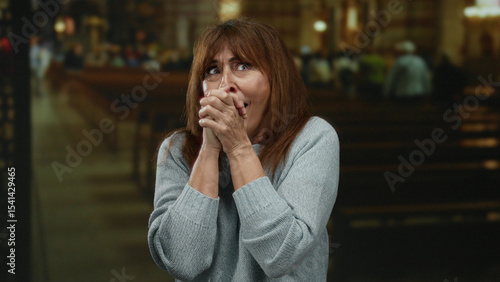 Woman praying intensely in a dimly lit church, capturing deep emotion and religious devotion in a solemn indoor setting.