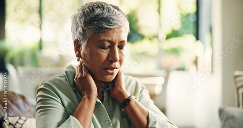 Living room, neck pain and mature woman with sore, massage or discomfort of injury from bad posture. Tension, swollen and stiffness of joints, osteoarthritis or muscle strain for old person in house