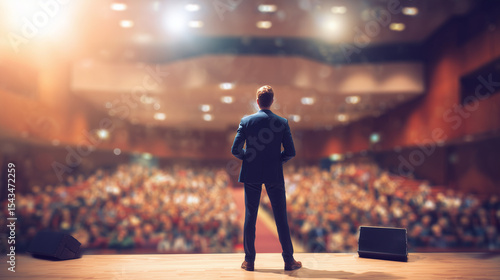 Business speaker presenting on stage, conveying leadership and vision with dynamic presence