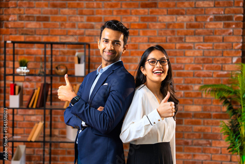 Posing with success and smiling confidently, Indian business professionals stand in office together