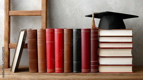 A ladder rests against a pile of books topped with a graduation cap, highlighting the importance of education in achieving modern business success.