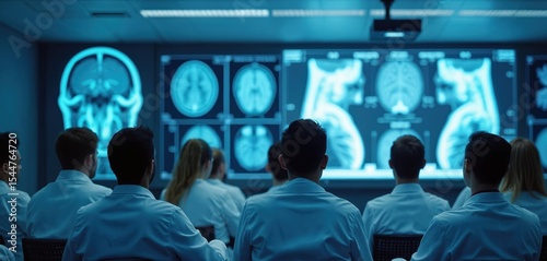 Medical students attend radiology lecture focused brain imaging in modern educational setting. Professionals study medical scans, magnetic resonance imaging, diagnostic techniques. Healthcare