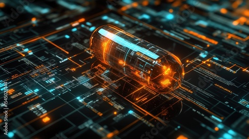 Futuristic medicine bottle with glowing high-tech circuitry inside, symbolizing advanced preventive medicine and health innovation.