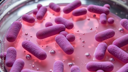 E. coli colonies on MacConkey agar, metallic pink bacterial growth, glossy agar surface, lab equipment reflections, perfect for microbiology and laboratory science visuals.
