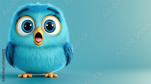 #1095505734Fluffy cartoon blue bird with expressive eyes and open beak stands on blue background, copy space