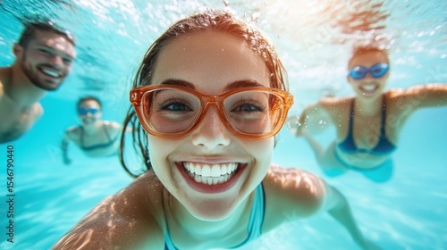 A joyful moment captured underwater as a group of friends enjoys a fun time swimming together, radiating happiness and connection in a vibrant pool setting.