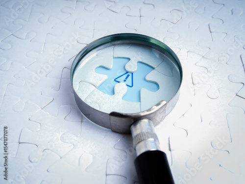 Business solutions, problems found, problem solving concept. Close-up blue caution sign, graphic on space of last missing piece, focus in magnifying glass lens, on white jigsaw puzzle background.