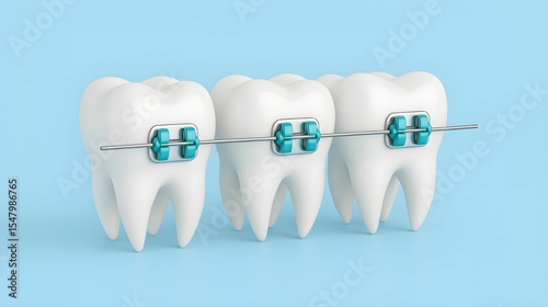 Three teeth with braces displayed on a blue background highlighting dental care and orthodontic treatment