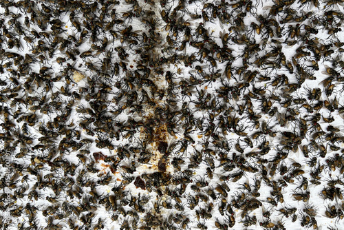 Massive cluster of houseflies on a flat surface, showing an infestation or unhygienic condition. The close-up image highlights sanitation issues, disease risks, and pest control concerns.