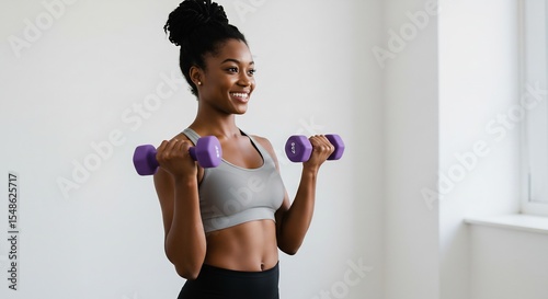 Happy young African American woman lifting weights during a home workout, fitness, healthy lifestyle
