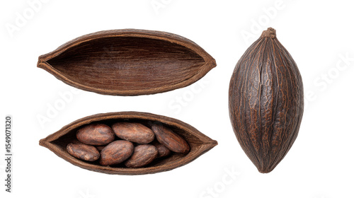 Cacao pod isolated on transparent background with open and closed shell showing beans inside
