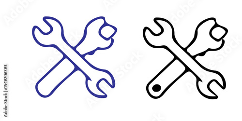 Two crossed wrenches depicted in blue and black outline on a white background in a simple illustration
