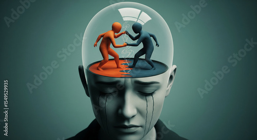 Abstract 3D illustration of a head with an open mind, showing two figures in conflict inside a glass dome, symbolizing internal struggle and mental health