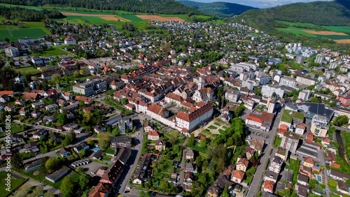 Panoramic aerial of the old town of the city Delémont in Switzerland on a sunny summer day