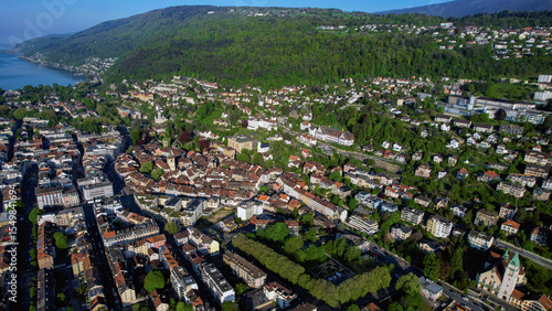 Panoramic aerial of the old town of the city Biel/Bienne in Switzerland on a sunny afternoon in summer