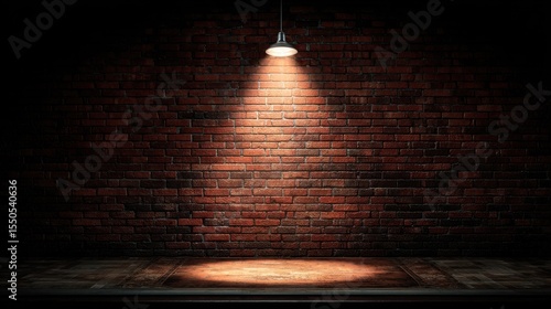 Classic comedy stage with brick wall backdrop, a bright center spotlight highlighting the stage floor, no furniture or props.