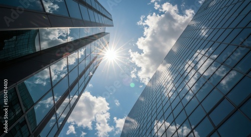 Skyward Gaze Modern buildings reach for sun in blue sky.