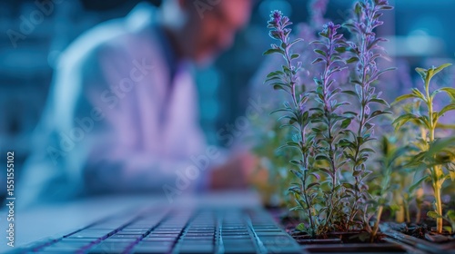 Extreme close-up on a keyboard with a blurred background of a scientist (male) and vibrant plants in a lab, symbolizing data input for biological research