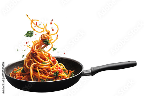 Spaghetti bolognese with ground beef tomato sauce and herbs flying from frying pan isolated on transparent background