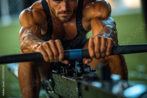 Focused muscular man rowing intensely on indoor rowing machine with visible sweat and determination