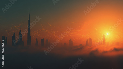 Smart city with connection network reciprocity over the cityscape social media networking systems that connects on the peak of success amid tall, innovative Smart city and graphs with statistics to a