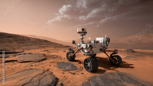 Mars rover exploring the red planet surface under a cloudy sky in a desolate landscape