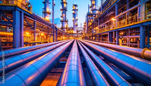 Night View of Industrial Refinery and Pipelines Energy Production and Refining