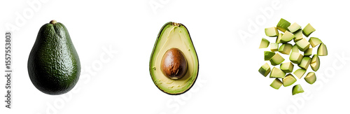 Avocado Whole, Halved, and Diced on Transparent Background