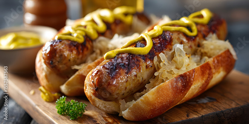 Grilled bratwurst sausages with mustard and sauerkraut in buns